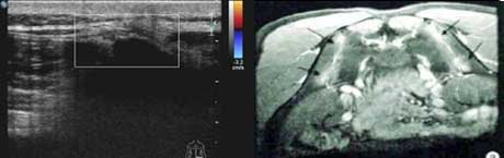 在对强直性脊柱炎治疗效果的监测上,肌骨超声可做到动态观察滑膜厚度的改变、积液多少的改变以及关节内及周围血流动力学的改变等。研究认为,超声能够敏感地发现关节滑膜及肌腱的病理改变,因此,它可以作为监测及随访强直性脊柱炎患者软组织病变及临床效果的常规方法,具有极好的临床应用价值。